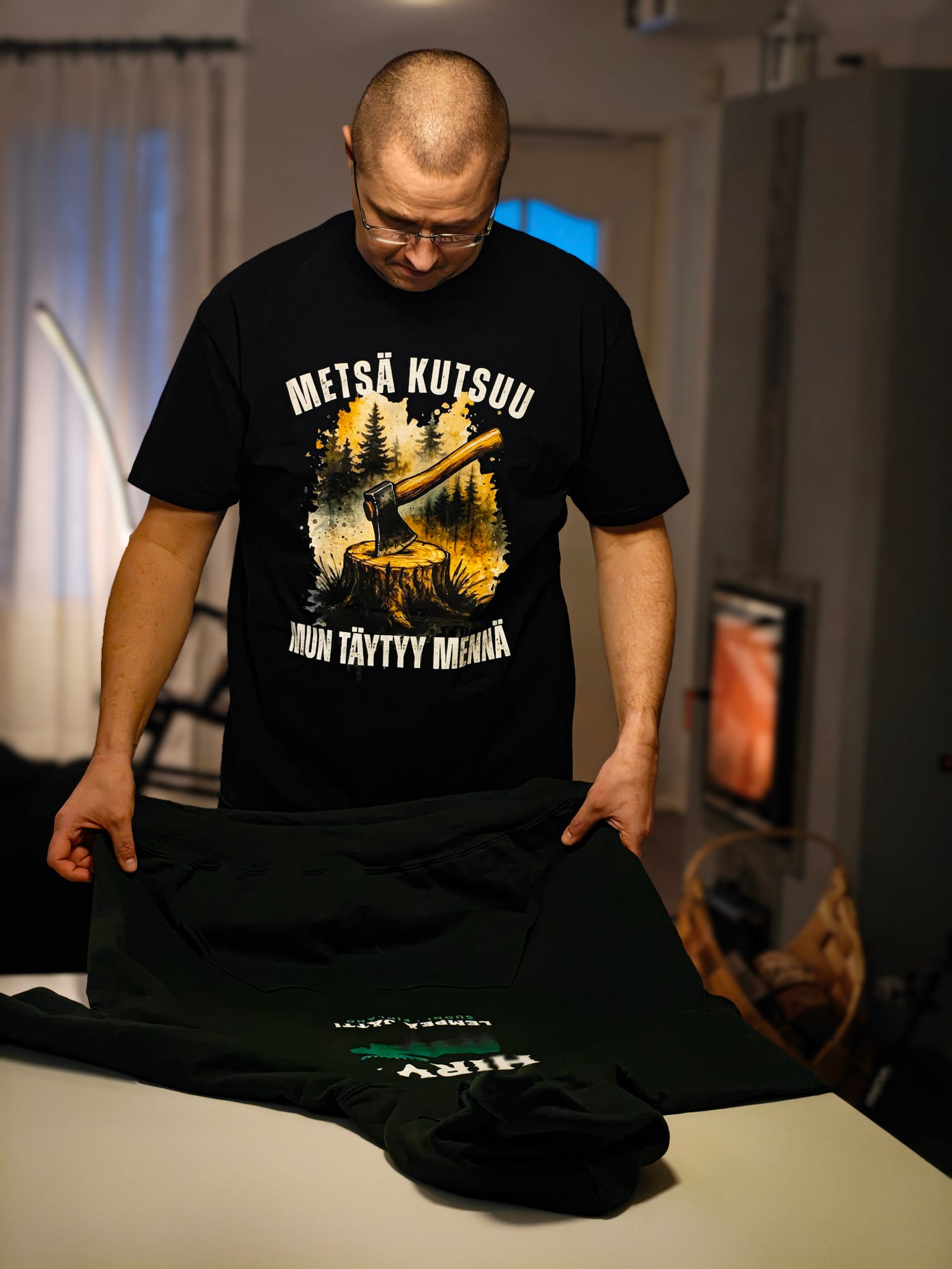 Paita oli juuri hänen mieleisensä, tekstiä myöten hän kun tykkää metsähommissa olla omassa metsässä puuhommissa.